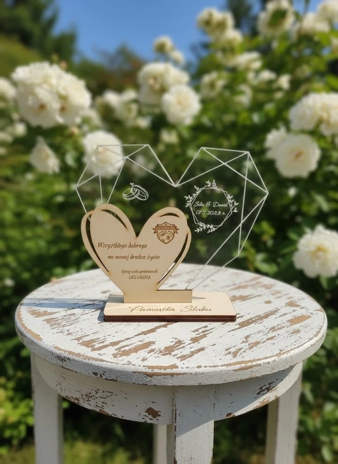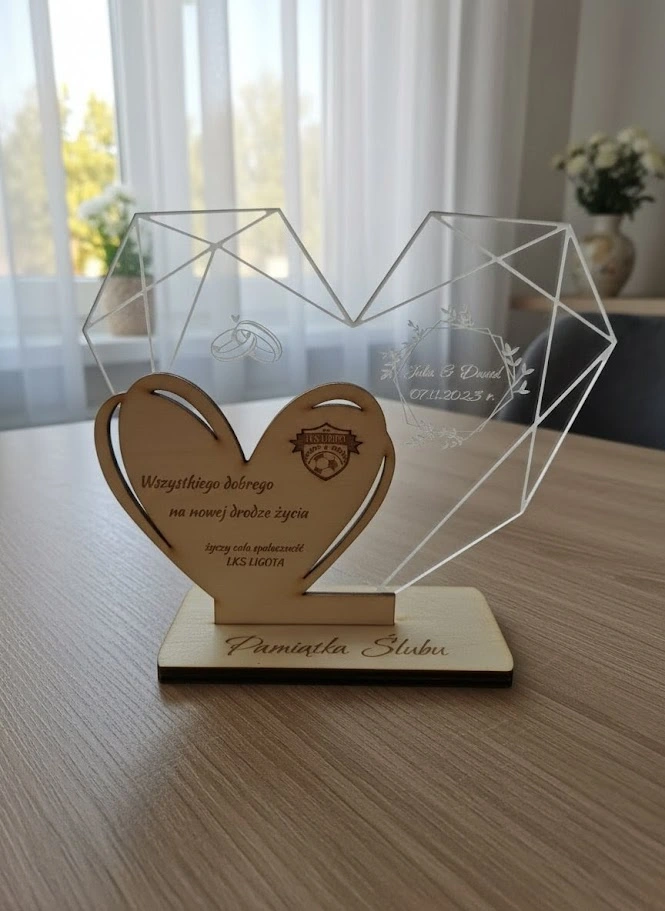 Zaskocz Parę Młodą prezentem, który nie trafi do szuflady, ale stanie się ozdobą ich nowego domu. Oferujemy wyjątkową pamiątkę ślubną wykonaną w technologii warstwowej (3D), łączącą ciepło naturalnej sklejki brzozowej z elegancją i połyskiem pleksi.