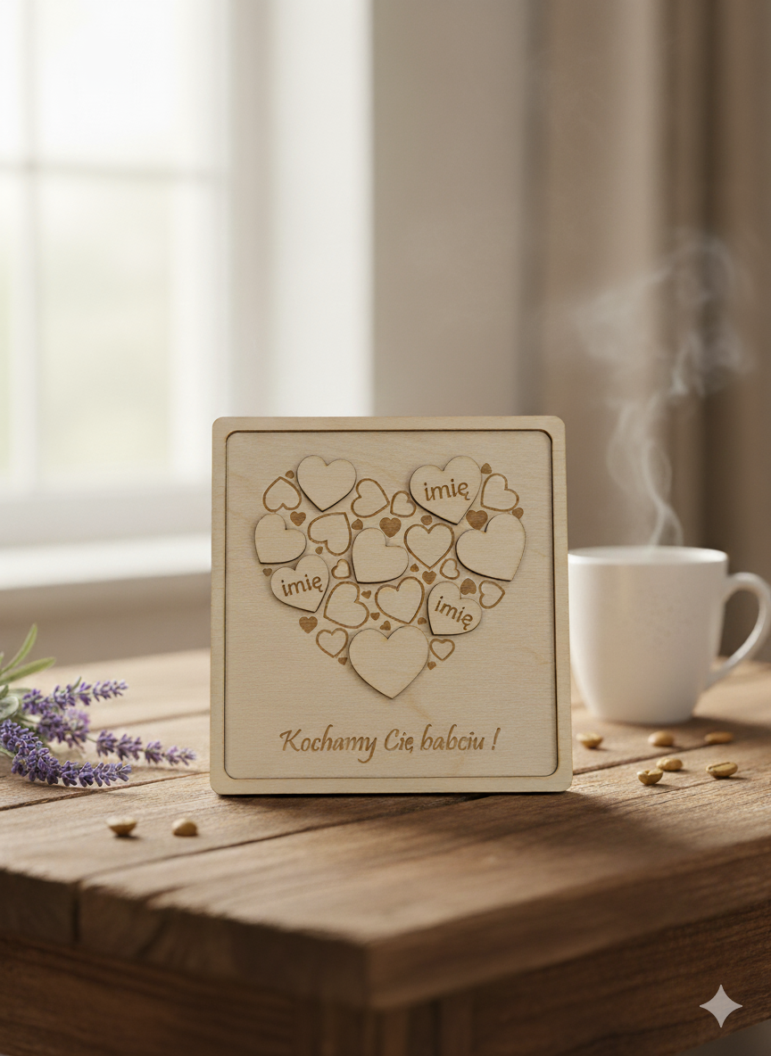 Ten uroczy obrazek, wykonany ze sklejki brzozowej, to idealny sposób na wyrażenie miłości i wdzięczności. W serduszkach możesz umieścić imiona wnuków lub inne osobiste słowa, które sprawią, że prezent będzie jedyny w swoim rodzaju.